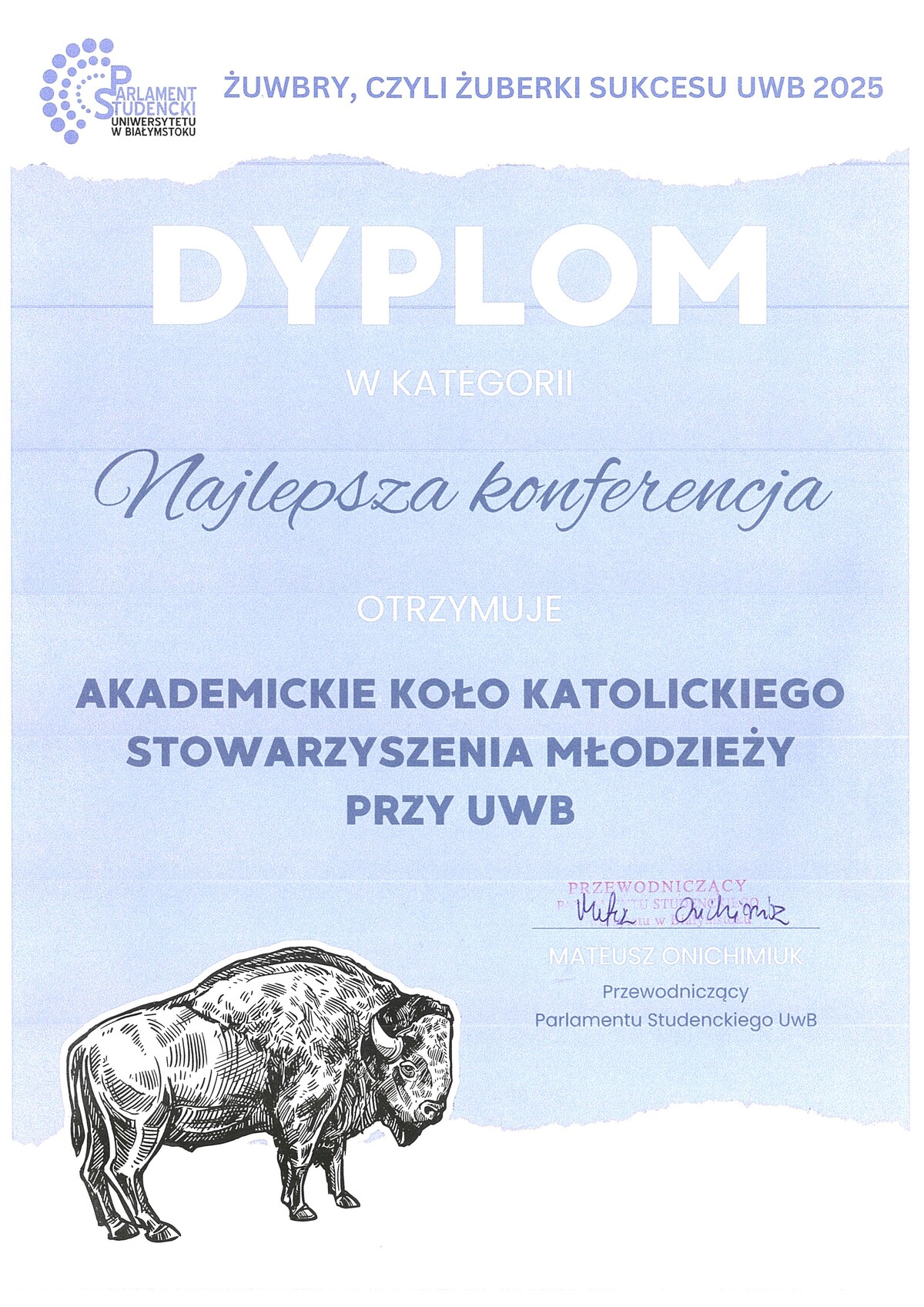 Niezmiernie miło nam poinformować, że Akademickie Koło Katolickiego Stowarzyszenia Młodzieży przy UwB otrzymało Nagrodę Parlamentu Studenckiego żUwBry 2025 w kategorii najlepsza konferencja – za IX Ogólnopolską Konferencję Naukową pt. Dziecko w historii – między godnością a zniewoleniem. Wychowanie od Bolesława Chrobrego do współczesności, współorganizowaną wraz z Katedrą Historii i Teorii Wychowania.