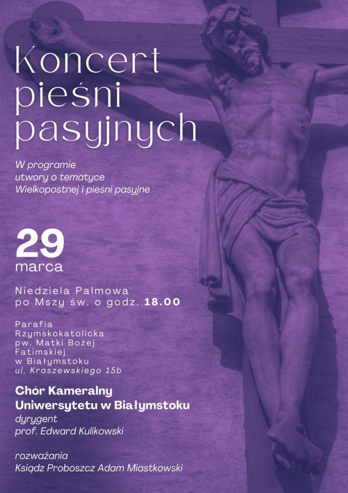 W trakcie koncertu wybrzmią także tradycyjne polskie utwory pasyjne w opracowaniach na chór przygotowanych przez prof. Edwarda Kulikowskiego. Utwory te zostały opublikowane w 2020 roku w zbiorze „Pozwól mi Twe męki śpiewać”. Usłyszymy między innymi chóralne wersje pieśni „Ogrodzie Oliwny” oraz „Wisi na krzyżu”.