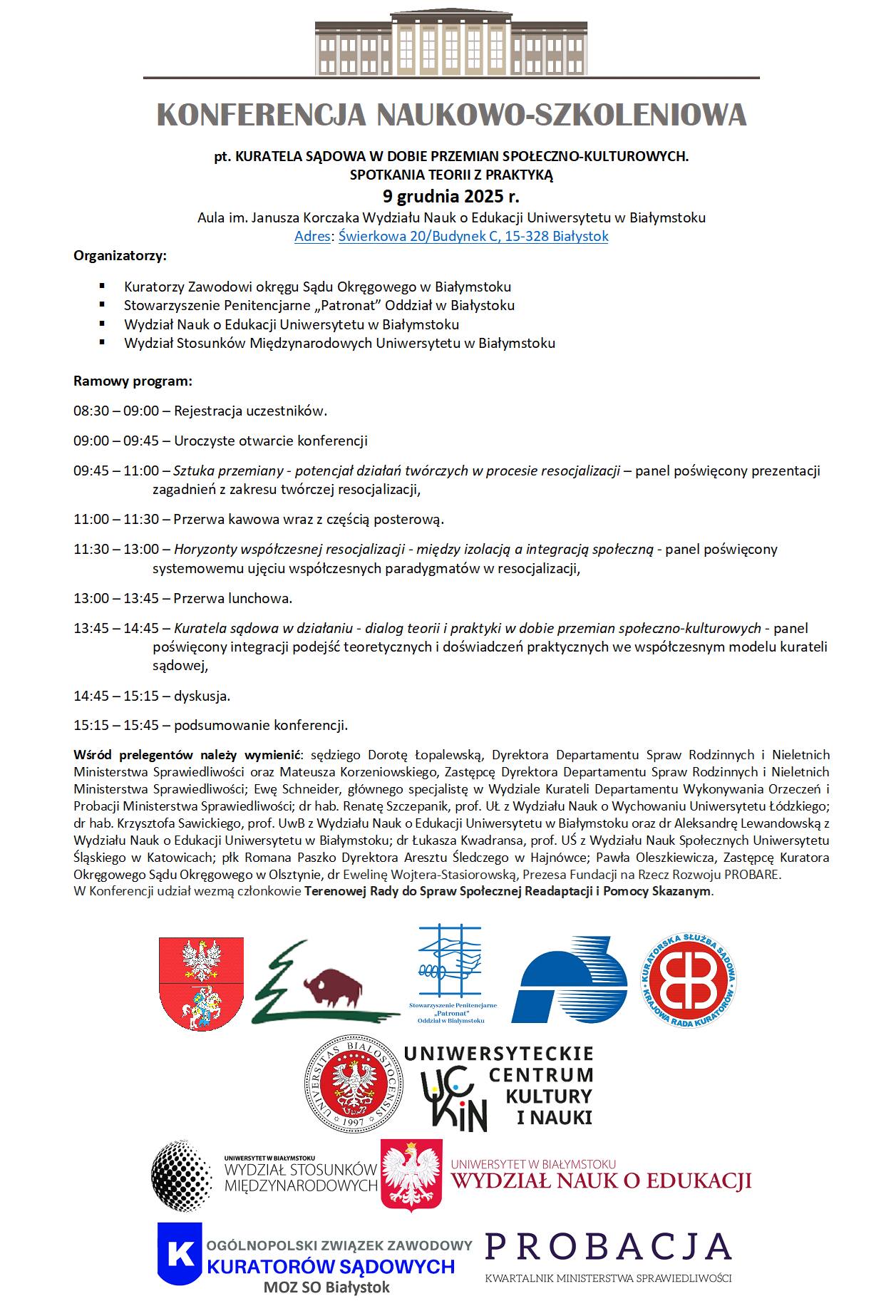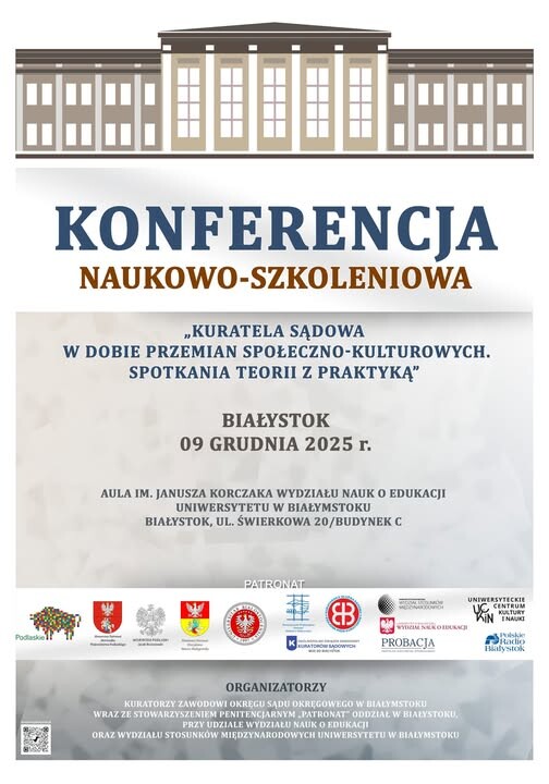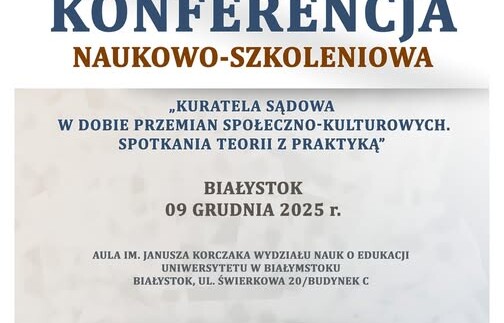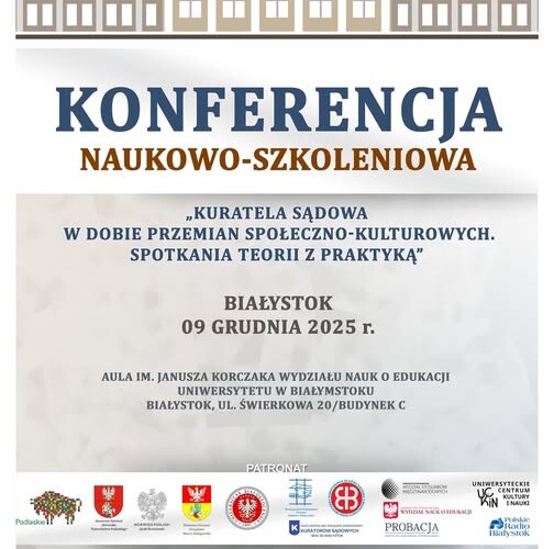 Zapraszamy na 📚Konferencję naukowo-szkoleniową „KURATELA SĄDOWA W DOBIE PRZEMIAN SPOŁECZNO-KULTUROWYCH”, która odbędzie się ⏰ 9 grudnia 2025 r. w Auli im. Janusza Korczaka Wydziału Nauk o Edukacji Uniwersytetu w Białymstoku (🏫ul. Świerkowa 20/Budynek C, 15-328 Białystok) organizowaną przez ⚖️Kuratorów Zawodowych Okręgu Sądu Okręgowego w Białymstoku, Stowarzyszenie Penitencjarne "Patronat" Oddział w Białymstoku, Wydział Nauk o Edukacji Uniwersytetu w Białymstoku, Wydział Stosunków Międzynarodowych - Uniwersytet w Białymstoku.