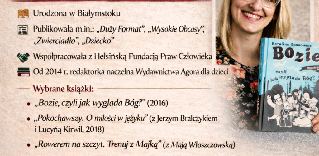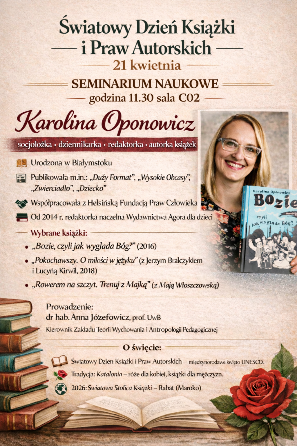 Z okazji Światowego Dnia Książki i Praw Autorskich, przypadającego każdego roku na dzień 23 kwietnia, na Wydziale Nauk o Edukacji  UwB,odbędzie się seminarium naukowe  na które została zaproszona  Karolina Oponowicz – socjolożka, dziennikarka, redaktorka i autorka książek, urodzona w Białymstoku. Autorka publikowała artykuły m.in. w magazynach „Duży Format”, „Wysokie Obcasy”, „Zwierciadło” oraz „Dziecko”. Pracowała również w Helsińskiej Fundacji Praw Człowieka, gdzie była odpowiedzialna m.in. za tworzenie projektów przeciwdziałających dyskryminacji. Od 2014 roku pełni funkcję redaktorki naczelnej Wydawnictwa Agora dla dzieci.