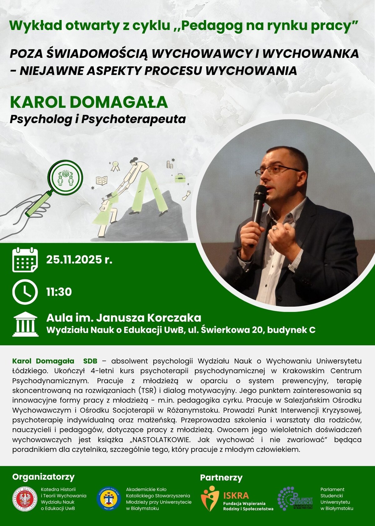 Celem wydarzenia z cyklu „Pedagog na rynku pracy” jest pogłębienie wiedzy studentów pedagogiki oraz praktyków pracujących z młodzieżą na temat ukrytych, często nieuświadamianych mechanizmów towarzyszących procesowi wychowania. W ramach wykładu „Poza świadomością wychowawcy i wychowanka – niejawne aspekty procesu wychowania” prelegent, Karol Domagała – salezjanin, psycholog, psychoterapeuta i doświadczony wychowawca młodzieży – przedstawi perspektywę opartą na praktyce wychowawczej, psychoterapii psychodynamicznej, pedagogice prewencyjnej oraz nowatorskich metodach pracy, takich jak pedagogika cyrku czy dialog motywacyjny.