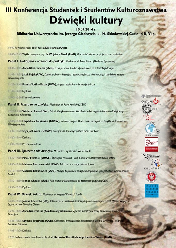 Gorąco zapraszamy 10. kwietnia b.r na Konferencję Studentek i Studentów Kulturoznawstwa pod hasłem "Dźwięki kultury". Miejsce: Biblioteka Uniwersytecka im. Jerzego Giedroycia w Białymstoku. POLECAMY!