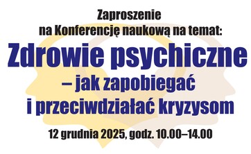 Informujemy, że 12 grudnia 2025 r. w godz. 10.00–14.00 w Podlaskim Urzędzie Wojewódzkim odbędzie się konferencja naukowa: „Zdrowie psychiczne – jak zapobiegać i przeciwdziałać kryzysom”, której współorganizatorem jest nasz Wydział!