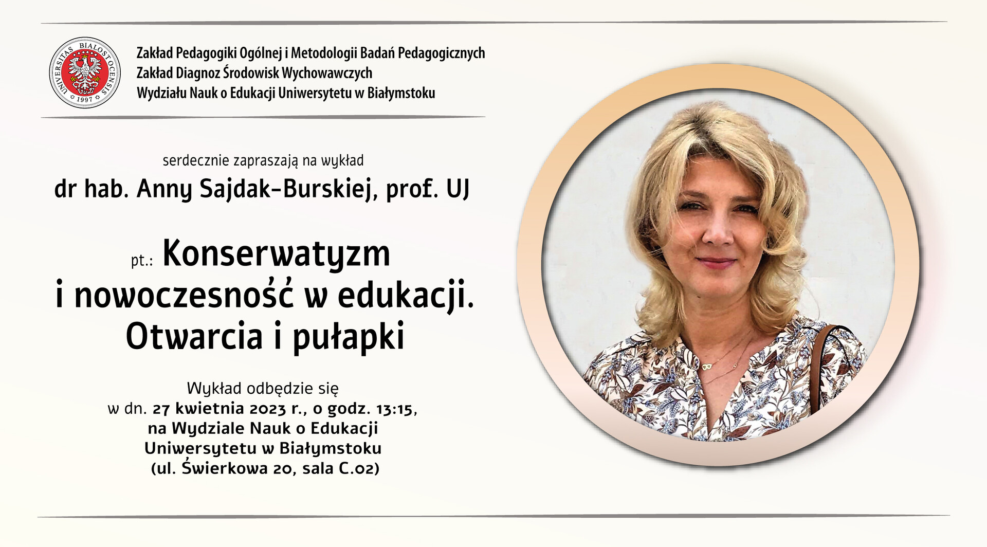 Plakat - Wykład dr hab. Anny Sajdak – Burskiej, prof. UJ pt. Konserwatyzm i nowoczesność w edukacji. Otwarcia i pułapki