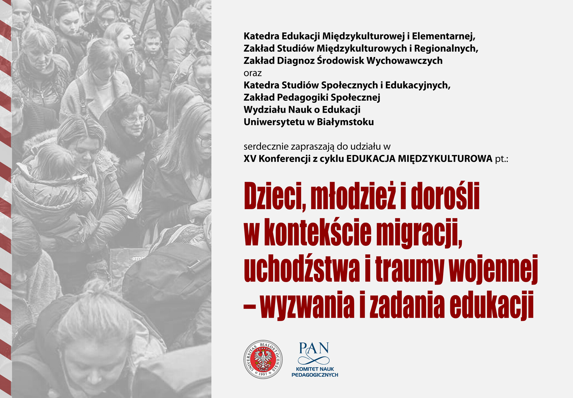 Plakat wydarzenia z napisem: XV Konferencji z cyklu EDUKACJA MIĘDZYKULTUROWA pt.: „Dzieci, młodzież i dorośli w kontekście migracji, uchodźstwa i traumy wojennej – wyzwania i zadania edukacji”